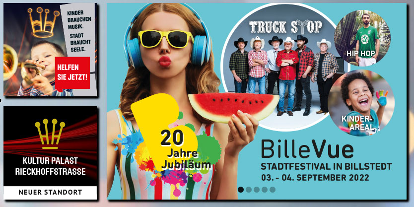Zu den vielen Höhepunkten der zweitägigen BilleVue gehören u.a. das Musical „Planet Billstedt‚ 22 – All the way up!“ das sich der Frage widmet, wie man ein Teil dieser Gesellschaft werden kann. Auch die Band Truck Stop wird sicherlich wieder viele Menschen begeistern. Glam Funk, K-Pop und der Auftritt der Soulsängerin Grace sind weitere Highlights des Wochenendes. Billstedt wird nicht nur zur Line-Dance-Hochburg, auch die St. Pauli Rock’n’Roll Kids und Suli Puschban werden die jüngsten Besucher in ihren Bann ziehen. Spaß gibt es für Kinder und Eltern auf dem Kinder-Klang- und zwei Kinder-Familien-Arealen. Die Verbindung zwischen Billstedt-Center und Kultur Palast bildet die Gesundheits- und Umweltmeile, auf der es neben vielen Informationen auch zahlreiche interaktive Mitmach-Angebote geben wird. Erfrischend, kulturell und kulinarisch geht es im Kultur Palast-Areal zu, wo Künstlerinnen und Künstler des Hauses sowie die Fusion Jam mit Dead Rabbit ein vielseitiges Programm darbieten. Die PalastKueche erwartet die Gäste mit kühlen Getränken und einem Festival-Essen.