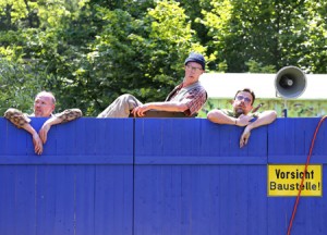 Große Bauvorhaben sind wohl noch nie rechtzeitig fertig gestellt worden. Auch auf der internationalen gartenschau hamburg muss noch an manchen Stellen nachgebessert werden. Ein Glück für die Besucher. Mit viel Elan, Pressluft, Lärm und Bier machen sie aus dem kleinen Problem ein großes: Wassereinbruch, Stromausfall, gekappte Telefonleitung und viel, viel Dreck. Die Arbeit wird diesen Typen so schnell nicht ausgehen. Und allmählich verdichtet sich der Eindruck, dass es ihnen weniger um die zeitnahe Erledigung ihrer Aufgaben geht, sondern vielmehr die Baustelle selbst mit ihren Maschinen, Förderbändern und Automatisierungen Gegenstand ihres Treibens wird. Nichts wird fertig, das aber sehr professionell.