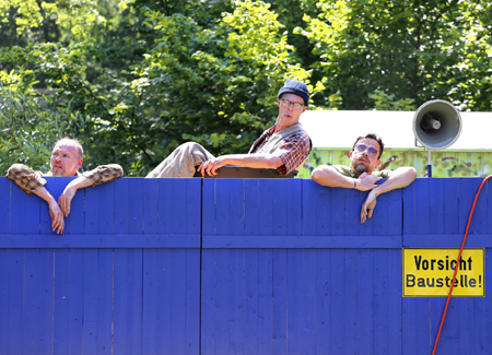 Und natürlich gibt es jede Menge Krach auf dem Bau: Bohrmaschinen, Hämmer, Mischer, Flex ergeben einen wunderbaren Klangkörper: Ein regelmäßiger Hammerschlag, dort ein dröhnendes Bohren, hier das Kreischen einer Säge – schon grooved die ganze Truppe. Auf Bierflaschen wird geblasen, und lustvoll werden Tiefbau-Tänze gestampft, wie sie nur der langjährige Umgang mit Presslufthammer und Dampframme hervorbringen kann. Bekloppt eben. Und so ist die Baustelle auch eine Metapher für das Leben: Glück und Erfüllung sind nicht der Lohn am Ende der Bauphase, sondern im täglichen Leben selbst zu finden.