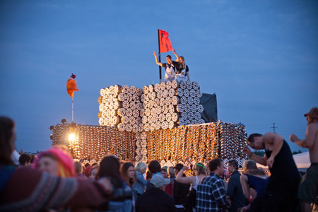 (CIS-intern) – Dass auf Festivals in der Regel ein unglaublich großes Kontingent an Leergut anfällt dürfte wohl definitiv kein Geheimnis mehr sein. Dies macht sich das MS DOCKVILLE Kunstcamp zu Nutze und transformiert gemeinsam mit den Performancekünstlern Jeremy Wade und Miguel Guiterrez auf dem Roskilde Festival in Dänemark Aluminiumreste in mehr als nur Luftschlösser. Die CHURCH OF BEER, ein Gebäude, eine Religion, ja, gar eine Lebenseinstellung entsteht auf Basis künstlerischen Schaffens, inspirierender Massendynamik und jeder Menge Liebe.
