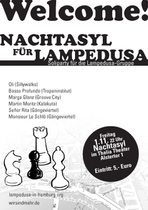 (CIS-intern) – Im Nachtasyl findet am Freitag spontan eine Solidaritätsparty für die Lampedusa-Flüchtlinge statt. Soliparty für die Lampedusa-Gruppe am 1. November 2013 ab 22 Uhr im Nachtasyl Hamburg. Eintritt 5,- Euro. Mit Oli (Sillywalks), Basso Profundo (Tropeninstitut), Marga Glanz (Groove City) ,Martin Moritz (Kalakuta), Señor Rita (Gängeviertel), Monsieur Le Schlö (Gängeviertel).