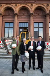 v.l.n.r.: Direktor der Hamburger Kunsthalle Prof. Dr. Hubertus Gaßner, Kultursenatorin Prof. Barbara Kisseler, Alexander Otto und Geschäftsführer der Hamburger Kunsthalle Dr. Stefan Brandt an der Außentreppe am Gründungsbau / © Hamburger Kunsthalle/ECE Photo: Norbert Weidemann