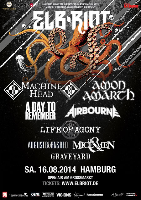 Das weitere Line-Up verspricht mit einer geballten Ladung Energie einen lauten und intensiven Tag auf dem Hamburger Großmarkt. Da wären beispielsweise die Thrash-Metal-Legenden von MACHINE HEAD, die derzeit an ihrem neuen Album arbeiten und ihren Studioaufenthalt nur für einige ausgewählte Shows unterbrechen. Ihr Besuch beim ELBRIOT wird exklusiv für Norddeutschland sein. Innerhalb von 20 Jahren hat sich die Formation aus Oakland einen festen Platz im Metal-Olymp erspielt – von ihren bislang sieben Alben verkauften sie weltweit mehr als 2,4 Millionen Einheiten. Die schwedischen Melodic-Death-Metaller AMON AMARTH, ebenfalls seit zwei Jahrzehnten dabei und mit MACHINE HEAD Co-Headliner des ELBRIOT 2014, blicken auf eine restlos ausverkaufte Tournee zurück und machen sich im Sommer wieder auf nach Deutschland. Mit dabei: Ihr aktuelles, bereits neuntes Album „Deceiver of the Gods“.